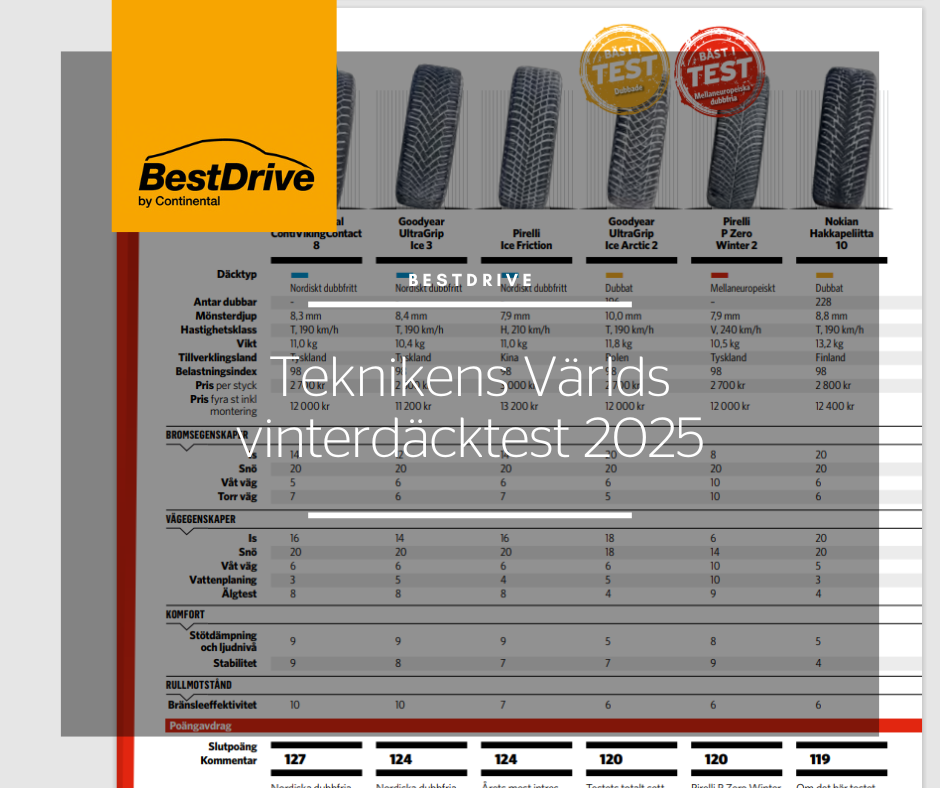 I årets stora vinterdäcktest (Teknikens Värld nr 20, 2025) kammar Continental VikingContact 8 hem förstaplatsen för andra året i rad. Däcket får beröm för sin kombination av grepp, stabilitet och lågt rullmotstånd – vilket också innebär lägst bränsleförbrukning i testet.